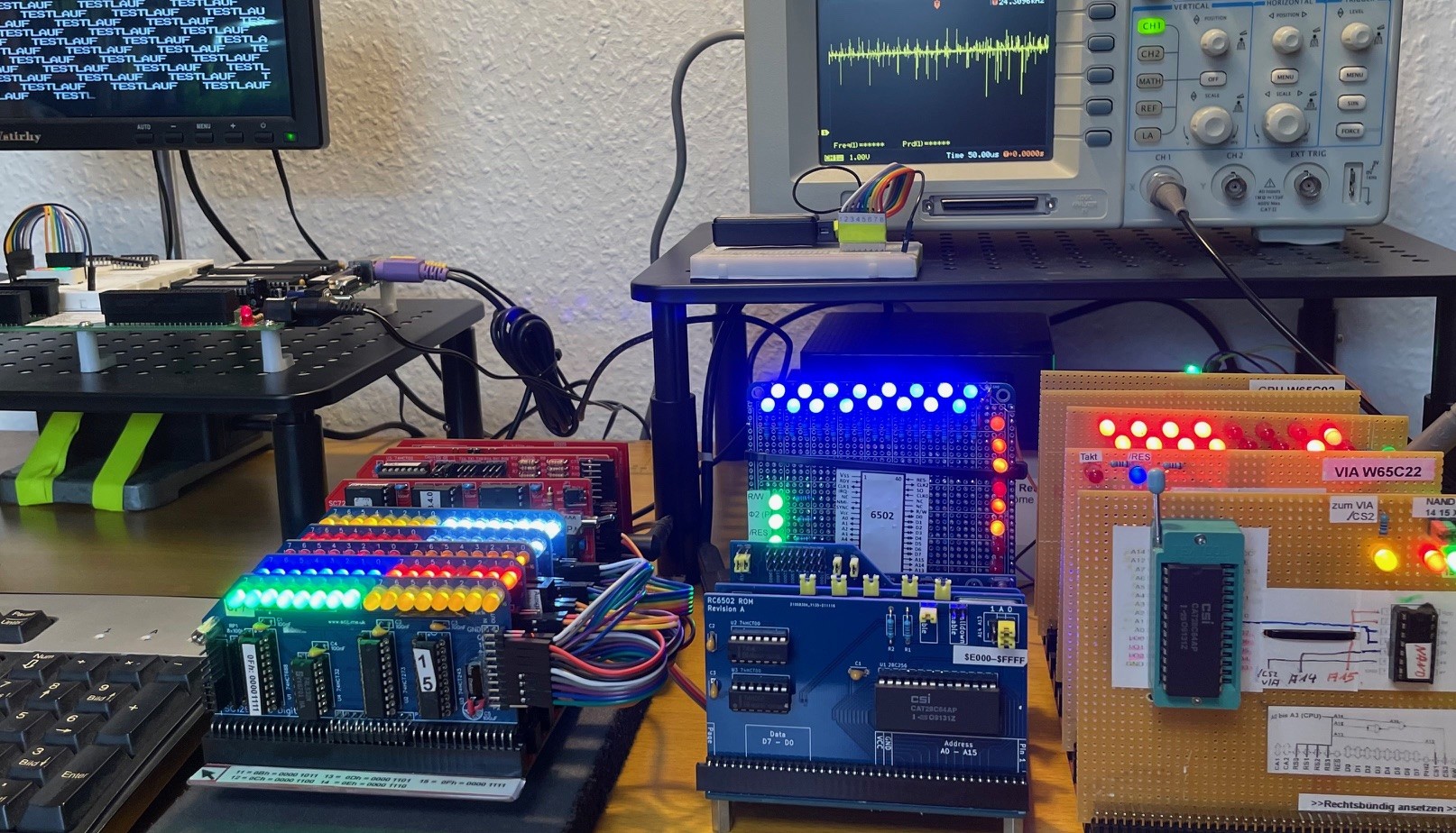 Meine Teststation für kleine 8-Bit-Computerentwicklungen Zwischen 1976 und 1985 entstanden aus Bastler- und Lehrprojekten die Grundformen des Personal Computers. Der 6502 (8-Bit-Mikroprozessor) legte die Basis für Apple und Commodore, der Z80 (ebenfalls ein 8-Bit-Mikroprozessor) für Lernrechner, CP/M-Maschinen und die ostdeutsche KC-Reihe mit den U880-Klonen. Der 8088 (auch ein 8-Bit-Mikroprozessor) öffnete den Weg zum PC-Standard. Ein 8-Bit-Rechner besitzt einen 8-Bit-Datenbus, das heißt, er kann pro Taktzyklus genau acht Informationsleitungen gleichzeitig nutzen, um Daten zwischen Prozessor, Speicher und Ein-/Ausgabe-Bausteinen zu übertragen. Dadurch verarbeitet er Zahlen und Befehle in Einheiten von einem Byte (8 Bit), also Werte von 0 bis 255. Auch die Register - die internen Arbeits- und Speicherplätze des Prozessors - sind 8 Bit breit, was die maximale Größe von Rechenoperationen begrenzt. Adressen hingegen sind meist 16 Bit breit, womit bis zu 65 536 Speicherstellen (64 kB) direkt angesprochen werden können. Diese Architektur macht 8-Bit-Rechner einfach aufgebaut, gut nachvollziehbar, sogar ich kann es verstehen, und ideal zum Lernen grundlegender Computertechnik. Tragbare Geräte hielten die 8-Bit-Architektur bis in die 1990er Jahre lebendig. Heutige Projekte knüpfen daran an - technisch sehr ähnlich, ideal für Selbstbauprojekte. Damit spannt meine kleine Sammlung einen historischen Bogen von den Anfängen des Mikrocomputers über Heim- und Lernsysteme der 1980er bis hin zu modernen Retro- und Lehrplattformen, die den Geist der frühen Computerei weiterführen. Folgende Computer befinden sich zurzeit in meiner kleinen 8-Bit-Sammlung: